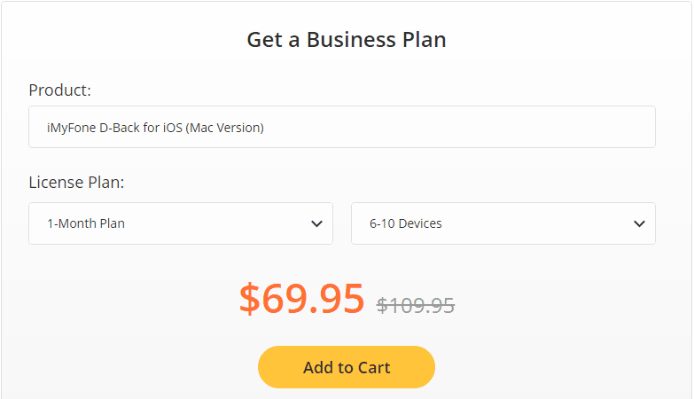 iMyFone D-Back Business Pricing starts at just $69.95 for 10 devices. That includes all features, free updates, and free tech support.