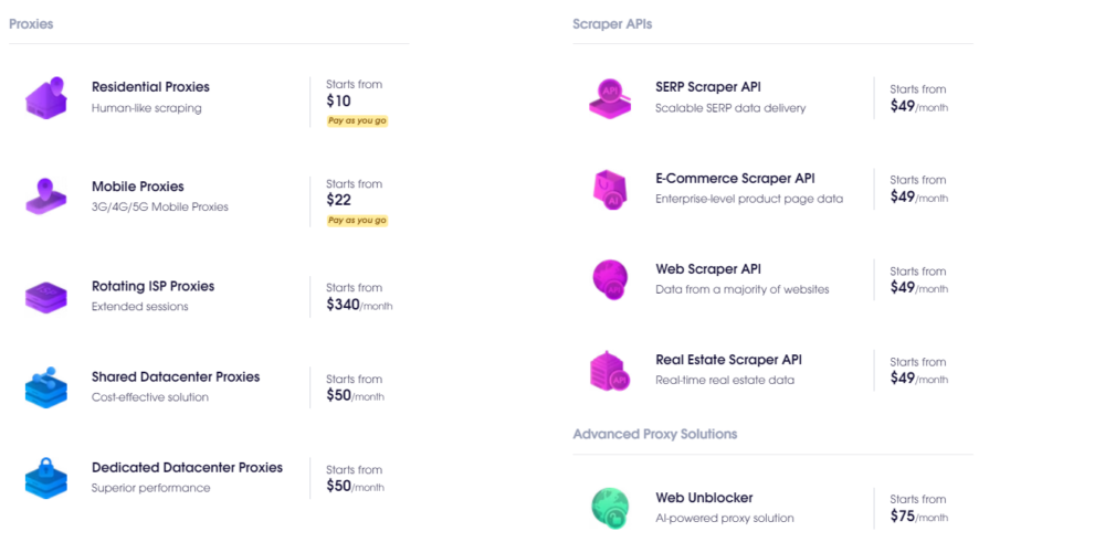 Oxylabs also offers static residential proxies, SOCKS5 proxies, Web Scraper, and Next-Gen Residential Proxies.