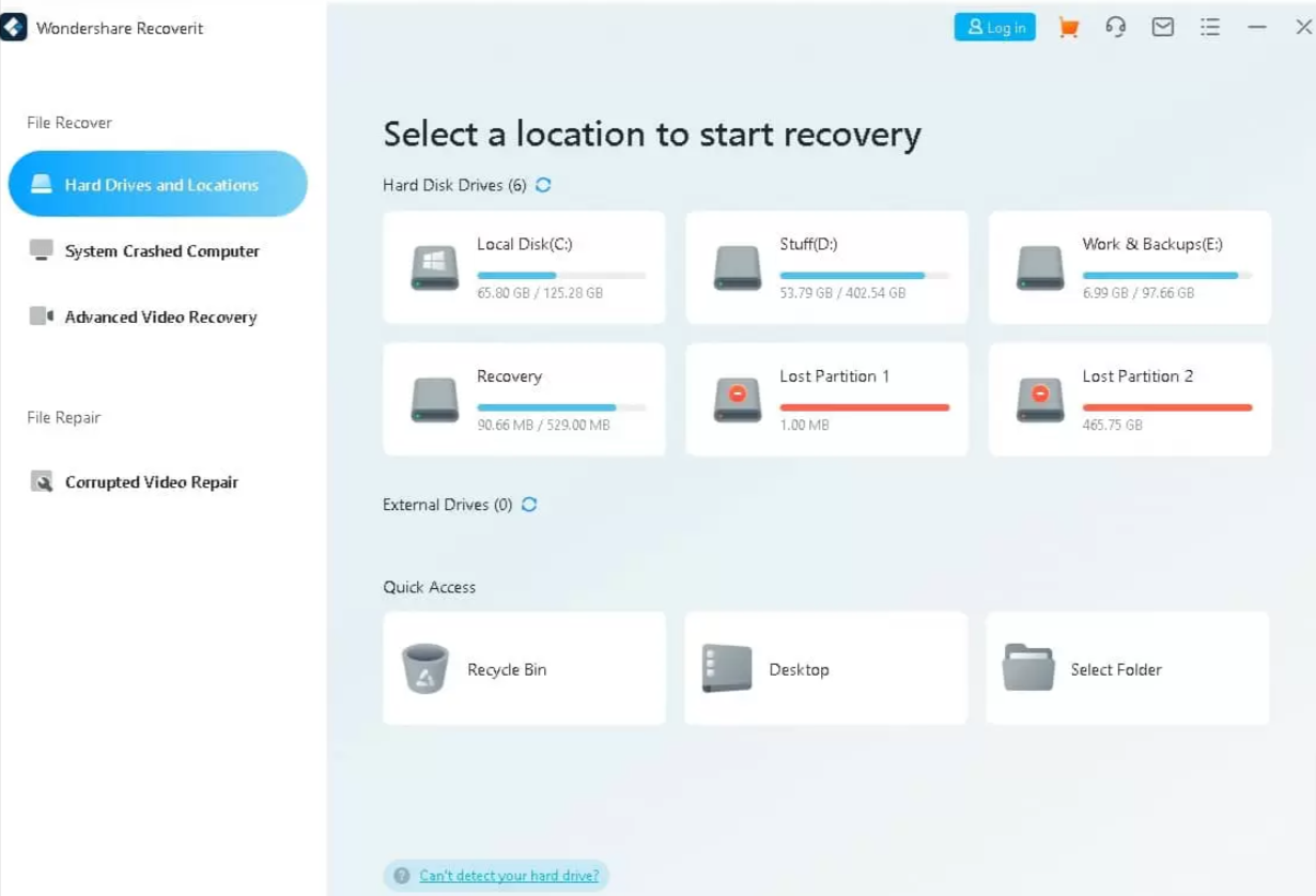 Wondershare Recoverit has a user-friendly interface that stands out as its best feature. It has a pleasing look with light blue colors and smooth window edges, and the icons are modern and well-designed.